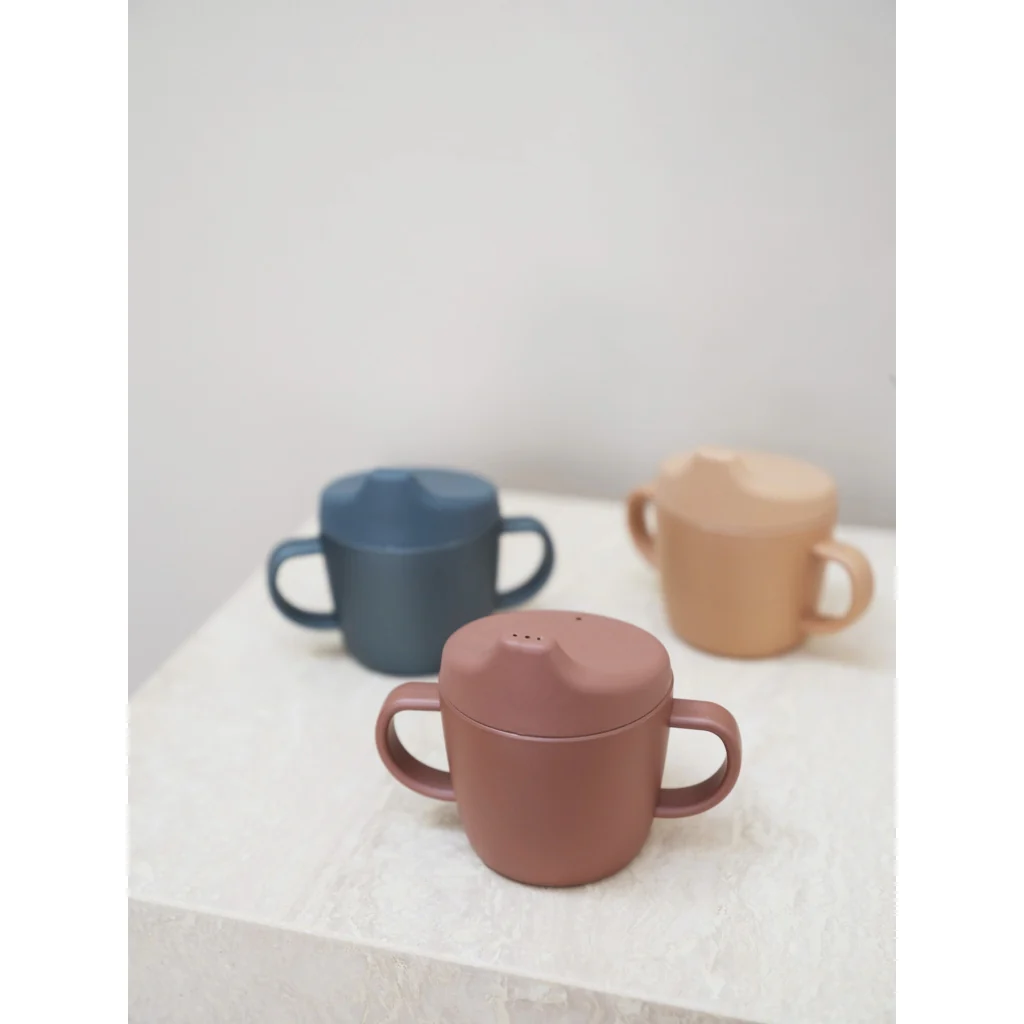 Met zijn zachte kleuren en minimalistische design is deze oefenbeker niet alleen praktisch, maar ook een mooie toevoeging aan de eettafel.